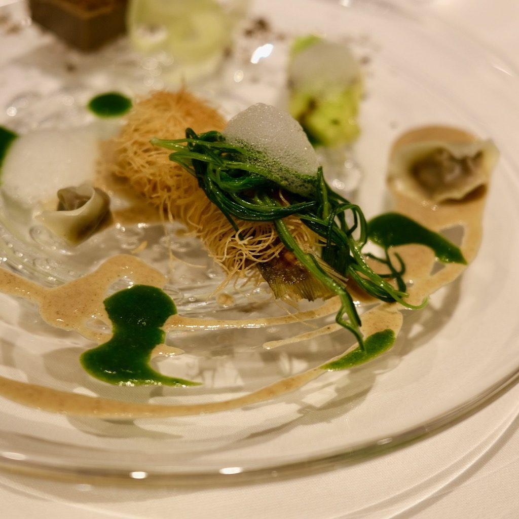 カダイフ(薄い麺)で包まれた揚げた鮎に、鮎のレバーパテといった様々な鯵の食べ比べ。